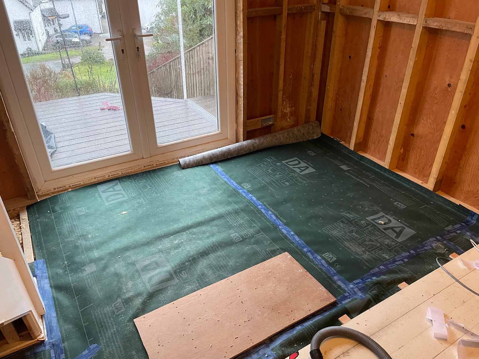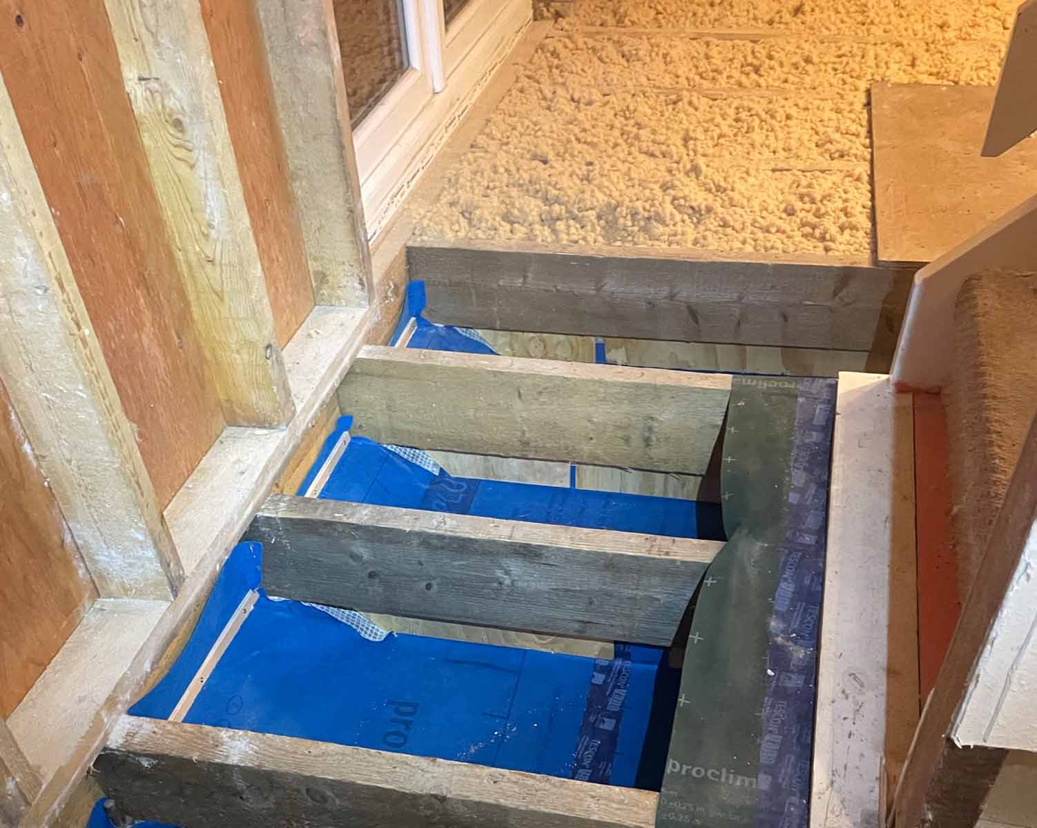 Porch: New porch walls are uninsulated stud walls with plenty of vents in them (this is an unheated space and not served by the MVHR, so need to make sure it’s sufficiently ventilated to avoid damp/mould problems). New porch roof is insulated with mineral wool, then breather membrane and a ventilated space before ply board holding the Resitrex flat roofing membrane.