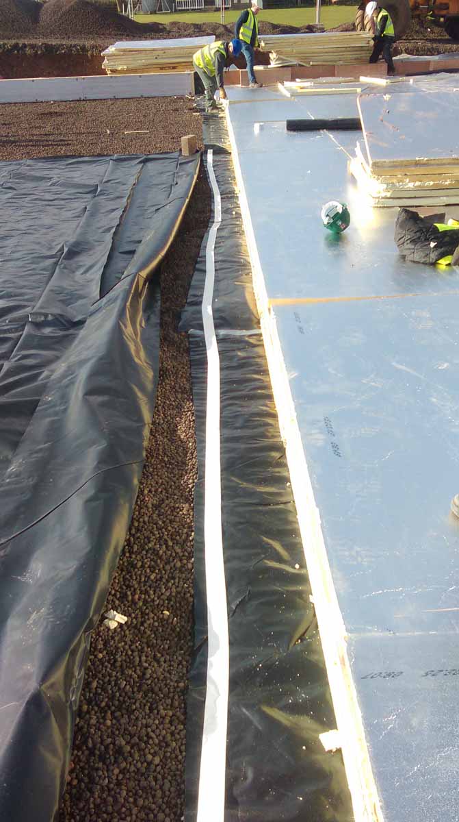 Celotex FR5000 insulation boards being fitted over the polyethylene DPM and 175mm Leca Insufil expanded clay insulation Celotex FR5000 insulation boards being fitted over the polyethylene DPM and 175mm Leca Insufil expanded clay insulation