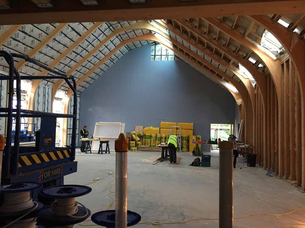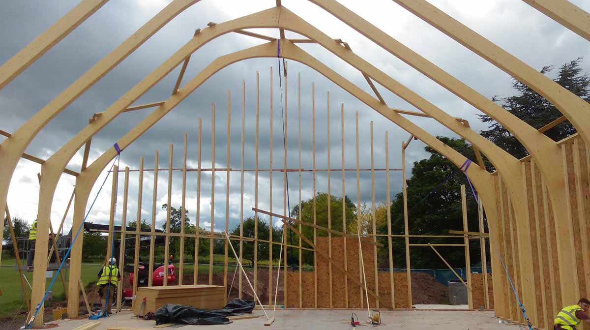 Erection of the timber frame superstructure, the unique shape of which was inspired by the rich historical tradition of vernacular timber framed “cruck” buildings around Worcestershire Erection of the timber frame superstructure, the unique shape of which was inspired by the rich historical tradition of vernacular timber framed “cruck” buildings around Worcestershire