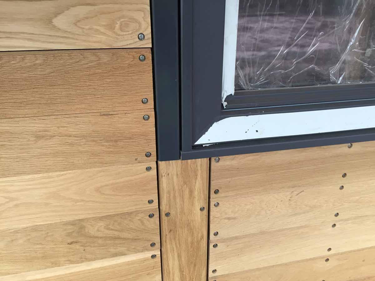 Rehau triple-glazed windows installed flush with the external oak cladding, with the insulation layer sitting behind this Rehau triple-glazed windows installed flush with the external oak cladding, with the insulation layer sitting behind this